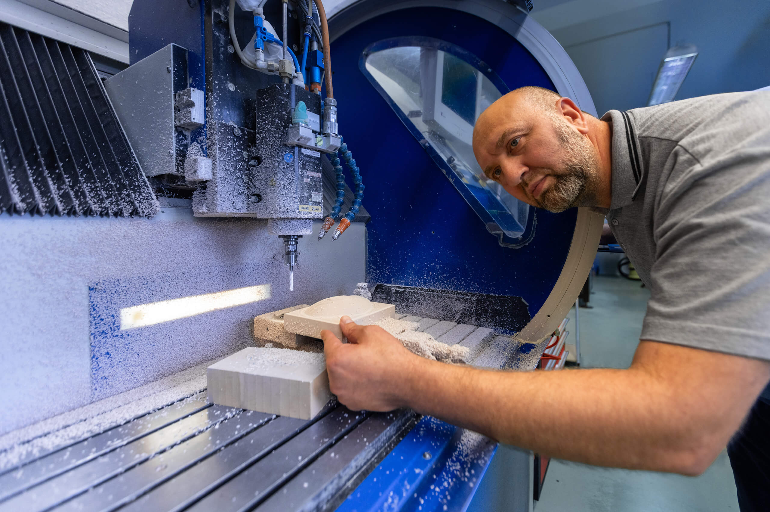 Nach Freigabe der Implantatform werden die Konstruktionsdaten in CNC-Steuerdaten umgewandelt und anschließend mittels computergestützter Fertigung in unserem hauseigenen Fertigungszentrum hergestellt.